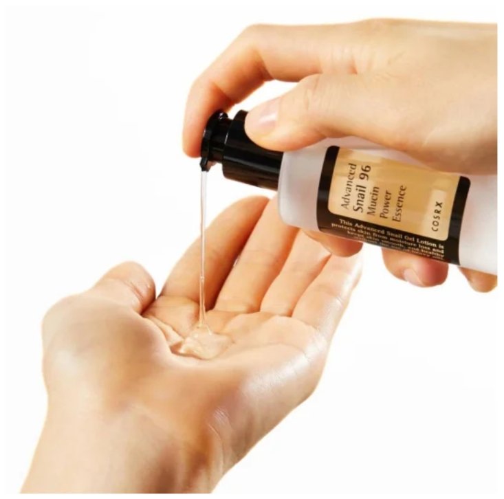 Se trata de una esencia concentrada que contiene un 96% de mucina (más conocida como baba de caracol) filtrada que no daña la piel y es eficaz para reparar el daño causado por diversos factores como la exposición al sol y el acné, además de mejorar la elasticidad de la piel, reducir arrugas y mantener un nivel de hidratación adecuado durante todo el día