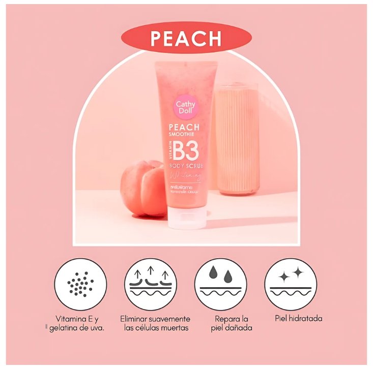 Dale a tu piel un mimo delicioso con el Peach Smoothie Vitamin B3 Body Scrub, un exfoliante corporal que combina el poder de la niacinamida (Vitamina B3) con extracto de durazno para dejar tu piel radiante, suave y renovada.
