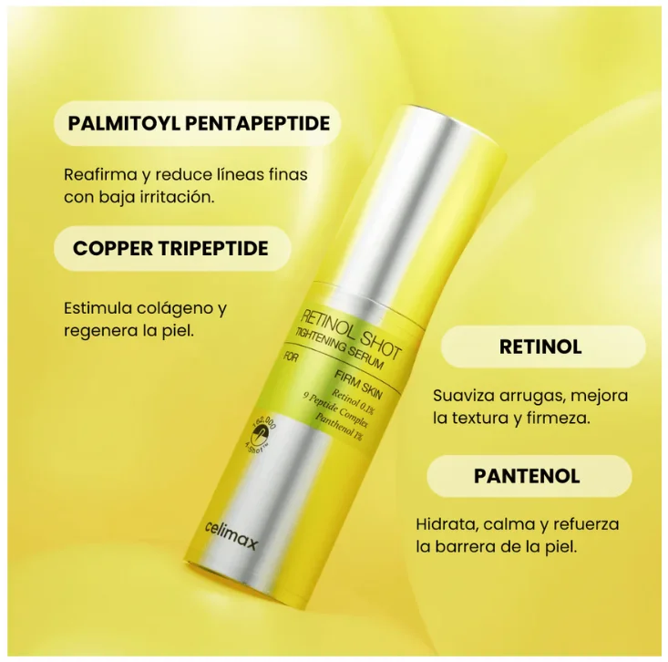 Sérum antiedad con 0,1 % de retinol puro, un complejo de 9 péptidos y tecnología A-Shot™, diseñado para mejorar la firmeza de la piel, suavizar la textura y reducir visiblemente arrugas y poros.