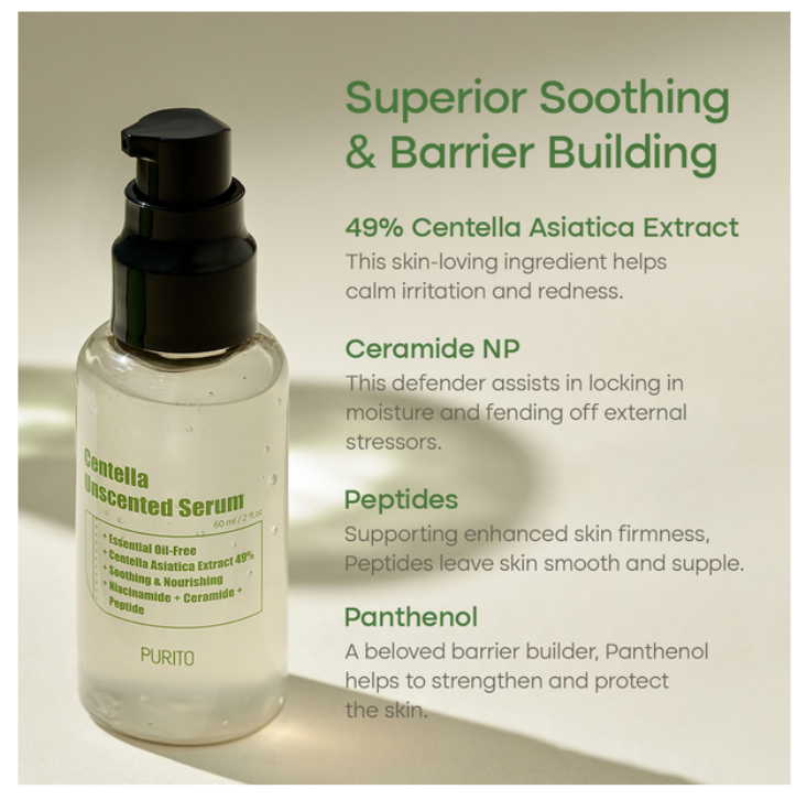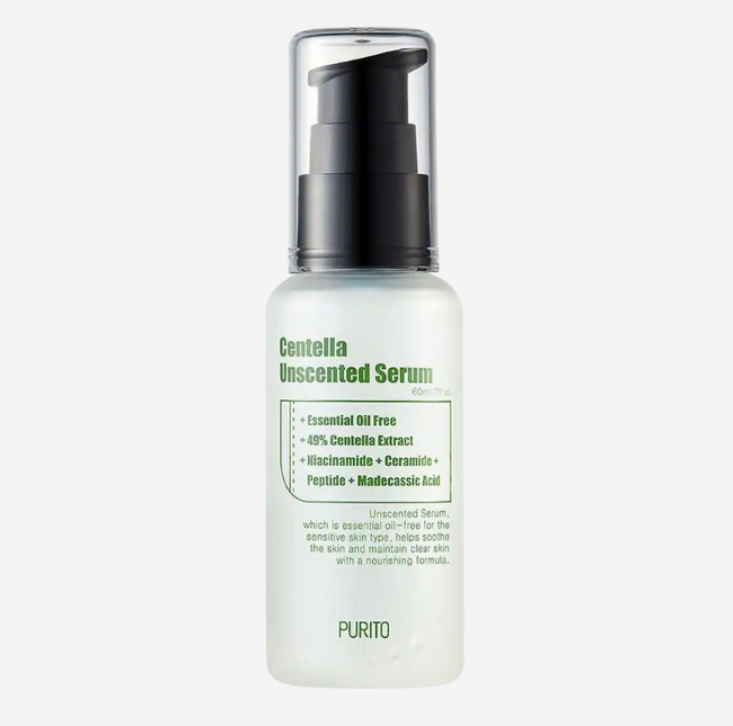 El suero sin perfume PURITO Centella con un valor de pH de 5.3 contiene solo ingredientes que son adecuados incluso para personas con piel sensible.