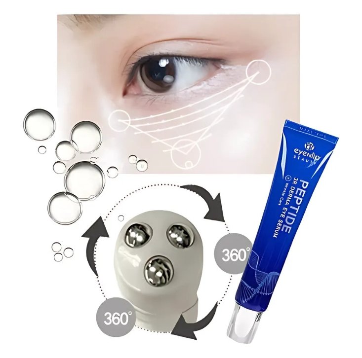 Contorno de ojos con aplicador de tres bolas masajeadoras diseñado para estimular la zona y mejorar la circulación. Este sérum con péptidos está formulado para hidratar profundamente y regenerar los tejidos del contorno de ojos, ayudando a promover la producción natural de colágeno y elastina. Como resultado, la piel se vuelve más firme, luminosa y con una apariencia visiblemente rejuvenecida.