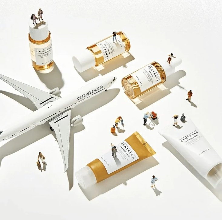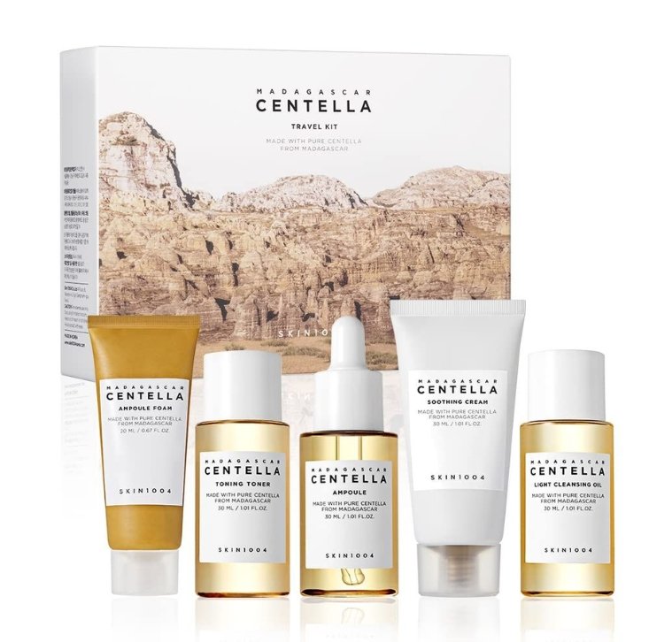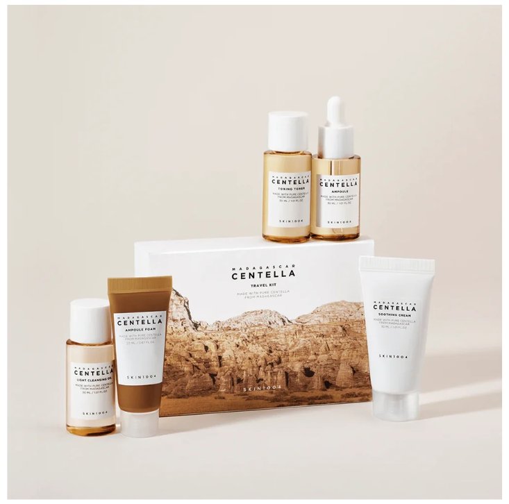 Un conveniente kit para viajar que contiene 5 de los productos de la línea Madagascar Centella de SKIN1004, en una nueva presentación.